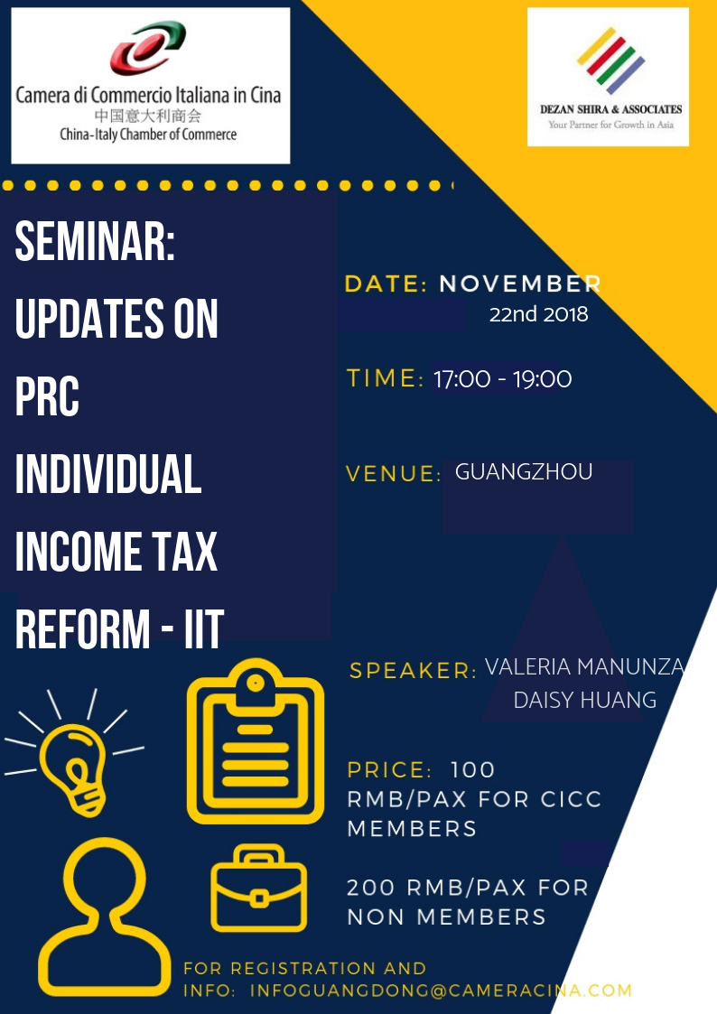 The CICC is organizing the seminar "Updates on PRC individual income tax reform - IIT" aimed to give an overview on the updates about the new tax regulations.
