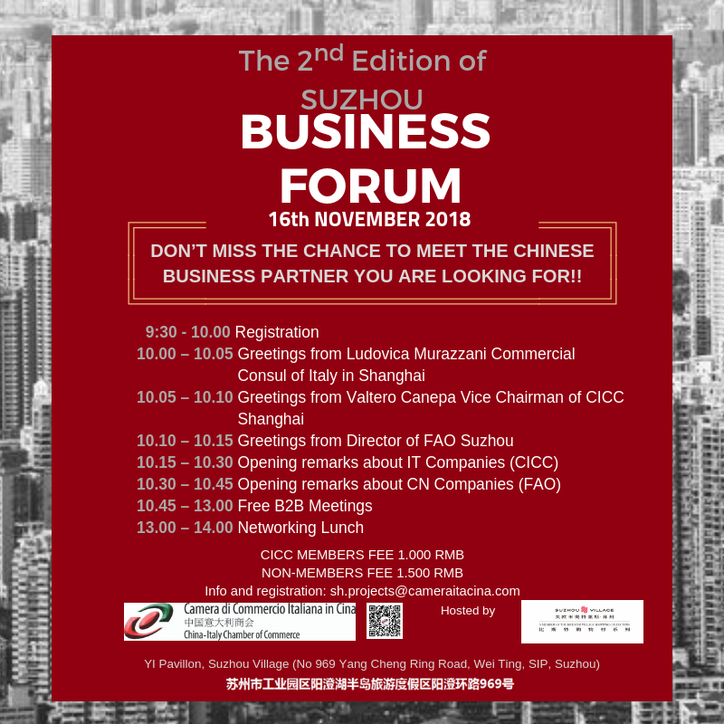 The China-Italy Chamber of Commerce is pleased to announce the Second Edition of Suzhou BUSINESS FORUM that will take place on November 16th 2018 at Suzhou Village.