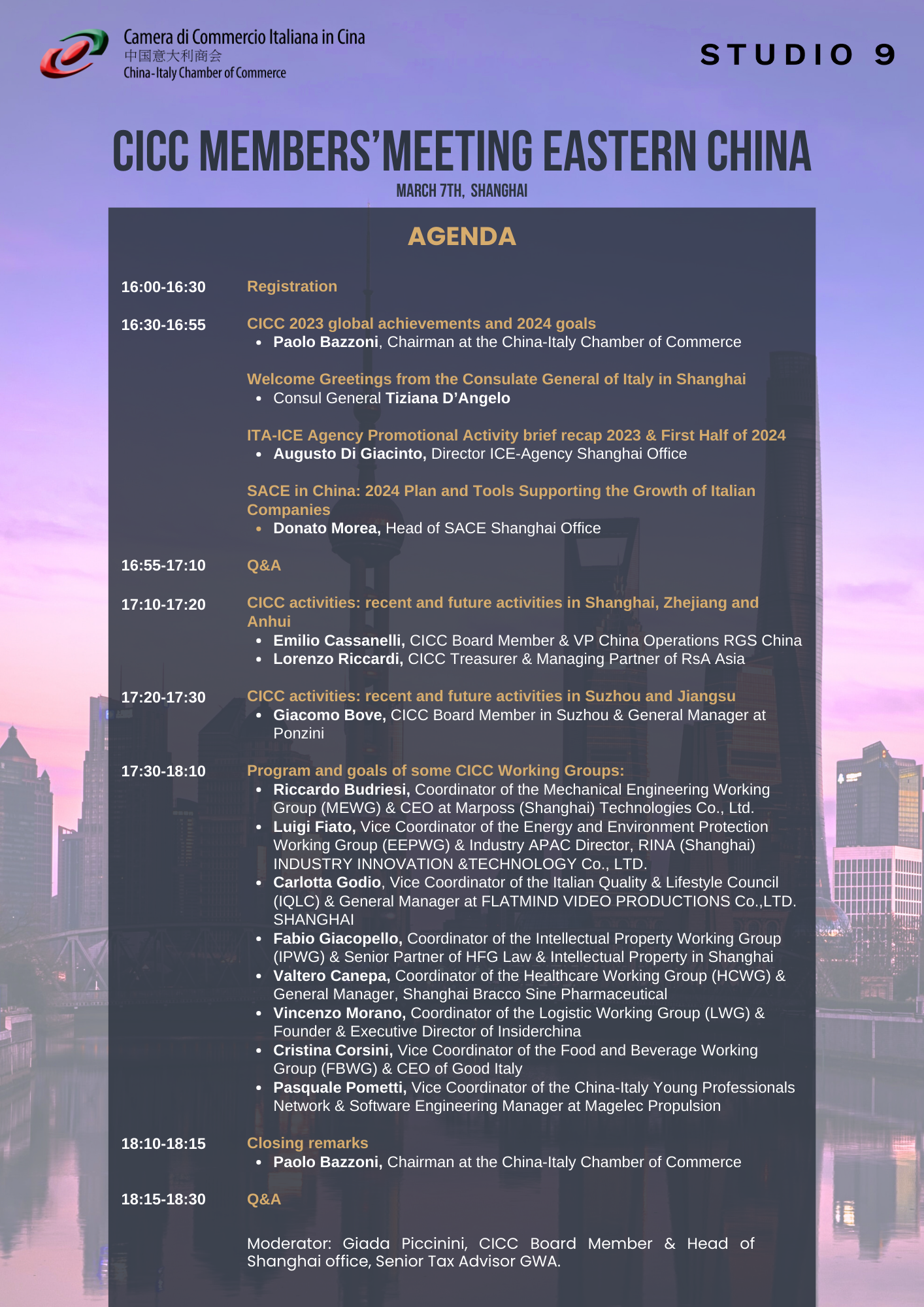 The China-Italy Chamber of Commerce is pleased to invite you to the Members' Meeting in Eastern China scheduled for Thursday, 7 March 2024 in Shanghai starting at 16:30 (Chinese time). Registration will start at 16:00.