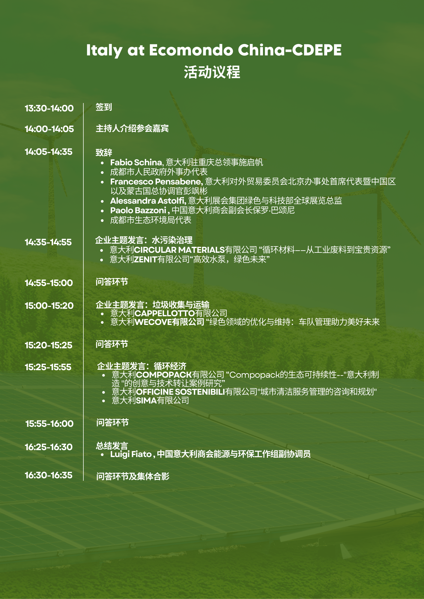 成都国际环保博览会是中国西部最大的绿色科技交流平台,已成功举办了17届。本次意大利国家展团企业涵盖水处理、垃圾回收和清运、固废处理和资源综合利用、环境监测、空气治理等专业领域等专业领域。今年,在第八届意大利可持续发展日和蓉欧产业对话的框架下,展团参展企业将就环保行业的可持续发展展开主题在活动后上进行主题发言。