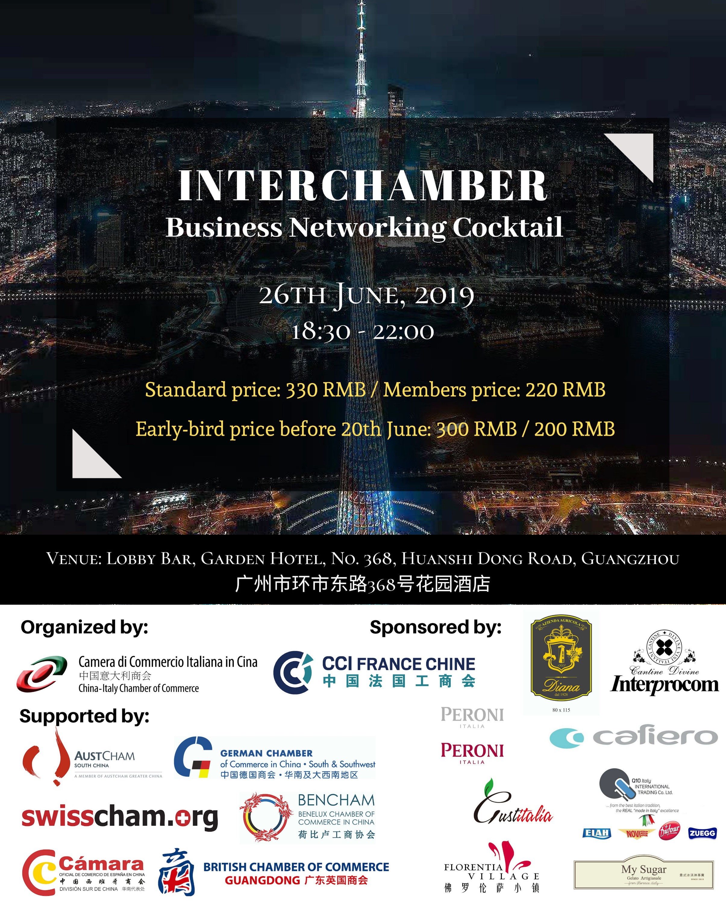 The China-Italy Chamber of Commerce, in cooperation with The British Chamber of Commerce Guangdong, The Australian Chamber of Commerce-South China, the Benelux Chamber of Commerce in China, The French Chamber of Commerce and Industry in China, The German Chamber of Commerce-South and Southwest China, Swiss Chinese Chamber of Commerce in China and The Spanish Chamber of Commerce in China, is glad to invite you to the Interchamber Business Networking, that will be held in Guangzhou on June 26th, at Garden Hotel.
