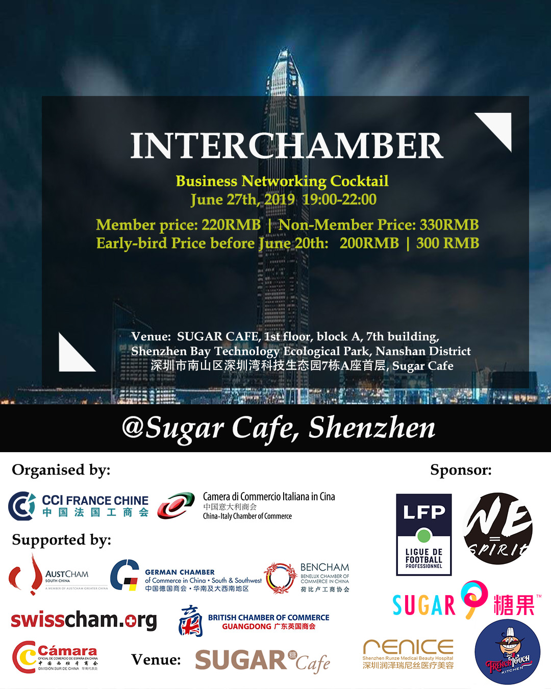 The China-Italy Chamber of Commerce, in cooperation with the British Chamber of Commerce Guangdong, the Australian Chamber of Commerce-South China, the Benelux Chamber of Commerce in China, the French Chamber of Commerce and Industry in China, the German Chamber of Commerce-South and Southwest China, the Swiss Chinese Chamber of Commerce in China and the Spanish Chamber of Commerce in China, is glad to invite you to the Interchamber Business Networking, that will be held in Shenzhen on June 27th, at Sugar Cafe Shenzhen.