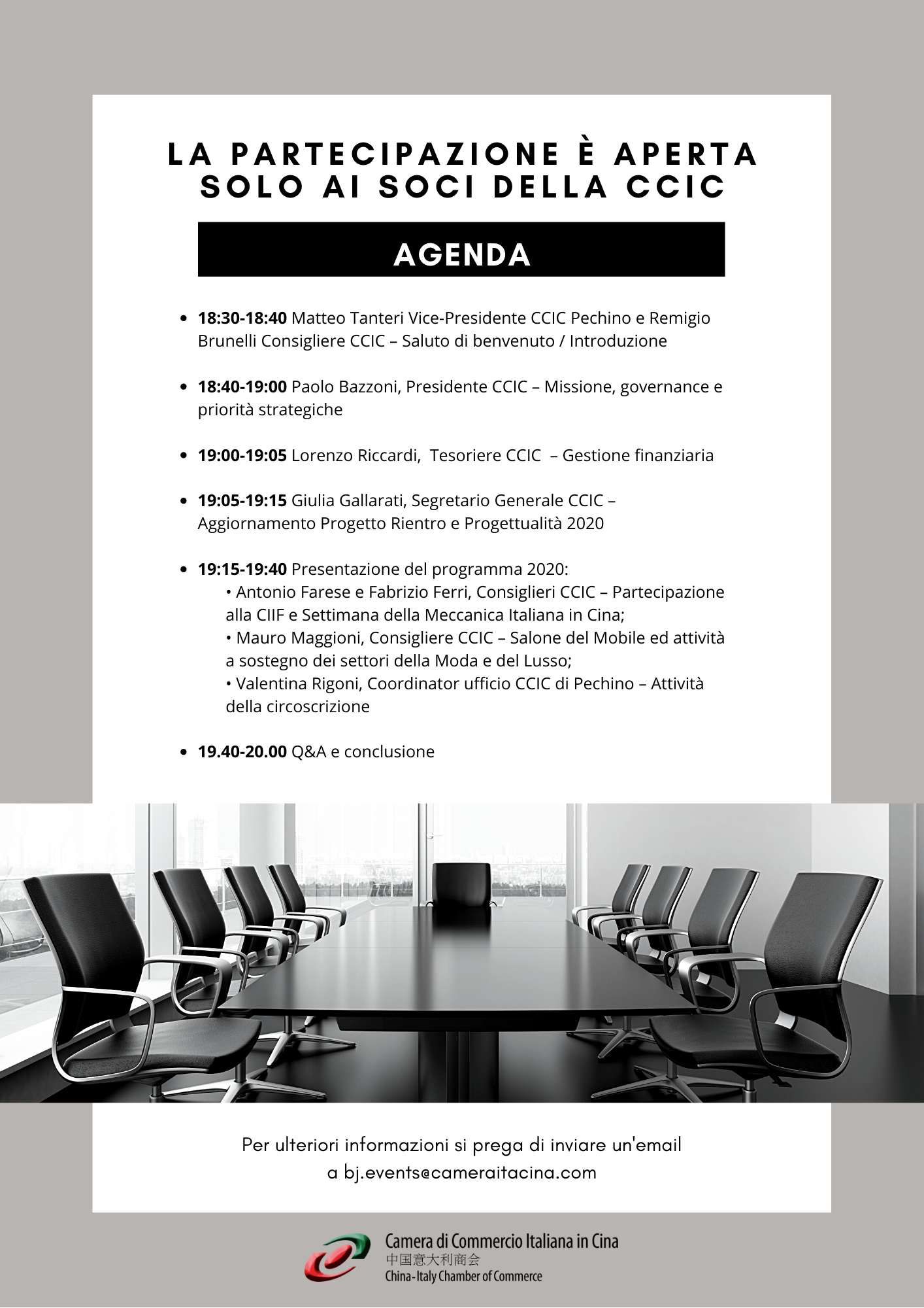 la Camera di Commercio Italiana in Cina (CCIC) è lieta di invitarvi a partecipare alla Riunione dei Soci che avrà luogo Lunedì 22 Giugno 2020 a Pechino (e trasmessa per via telematica) dalle ore 18.30 alle ore 20.00.