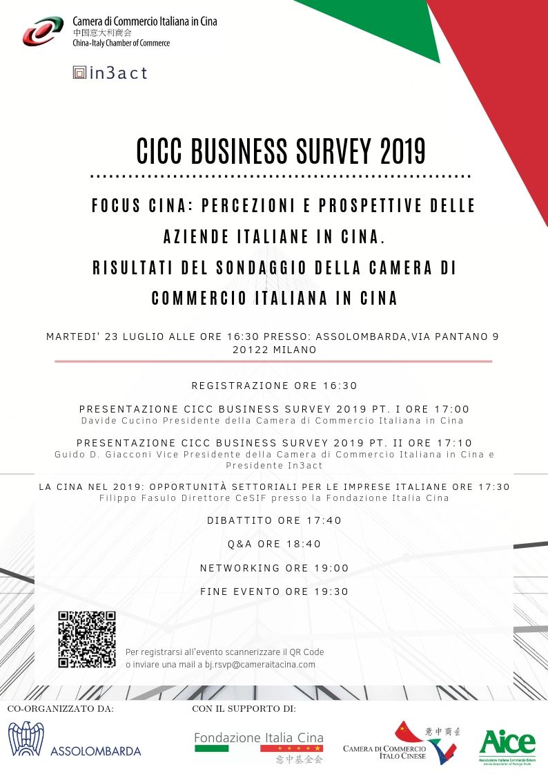 La Camera di Commercio Italiana in Cina organizza insieme ad Assolombarda la presentazione dei risultati del CICC Business Survey2019 il giorno 23 Luglio presso la sede Assolombarda, Via Pantano 9 Milano.