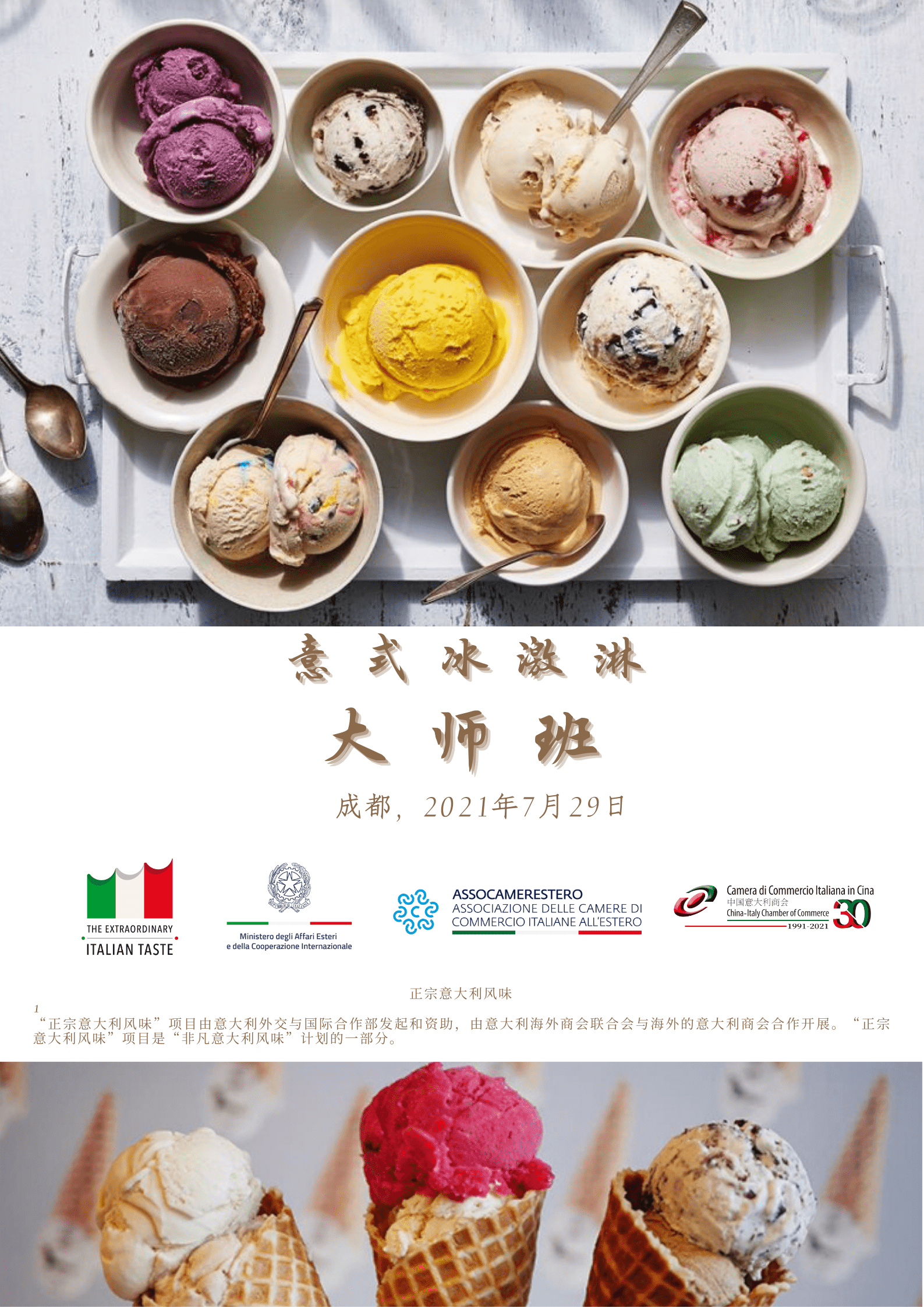 中国意大利商会很高兴宣布“意式冰激淋”大师班将于2021年7月29日在中意文化城市交流会客厅 (四川天府新区煎茶街道鸿湘村5组168号)举行。