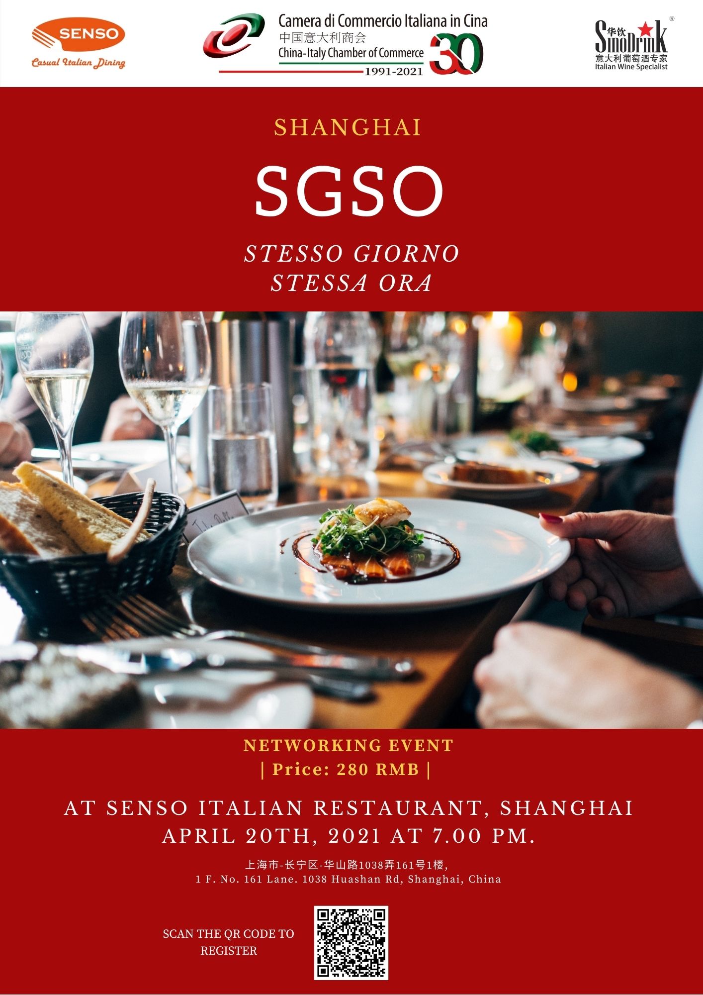 尊敬的会员以及朋友们, 中国意大利商会(CCIC)诚邀您参加SGSO月度非正式会议。 社交活动将于4月20日星期二在Senso意大利餐厅举行,晚上7点开始。 网上支付的晚餐价格是280元人民币每位,价格包括美食和饮料。