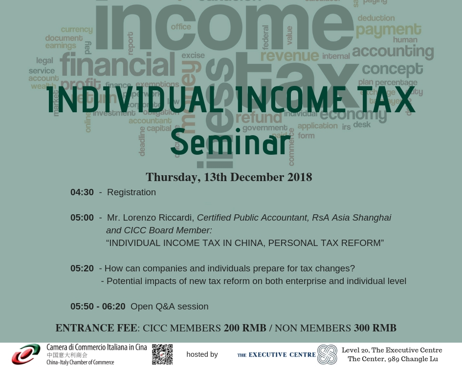 中国意大利商会很高兴地邀请您参加于12月13日在上海世纪商贸广场20层德事商务中心举行的“个人所得税法”研讨会。
