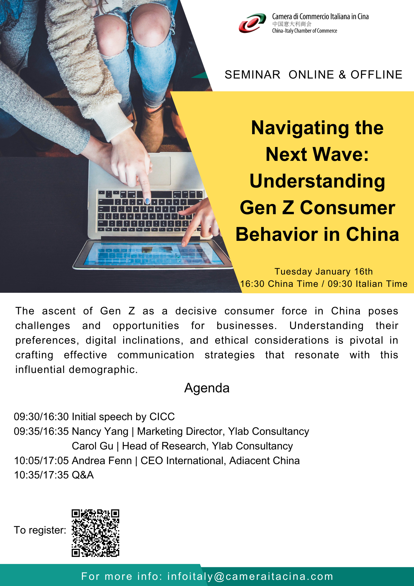 The China-Italy Chamber of Commerce (CICC) invites you to an exclusive event that peers into the intricate world of Gen Z consumer habits in China, both online and at our Shanghai office on January 16th at 16:30 (09:30 Italian time).