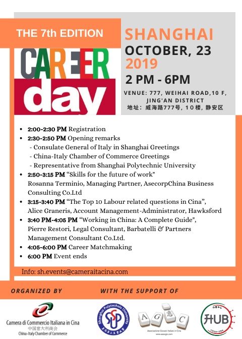 The China-Italy Chamber of Commerce, with the support of Shanghai Polytechnic University, AGIC (Associazione Giovani Italiani in Cina) and Hub Italia Cina, is glad to invite all the Italian Students and Young Professional at the Career Day, which will take place on October 23 in Shanghai.