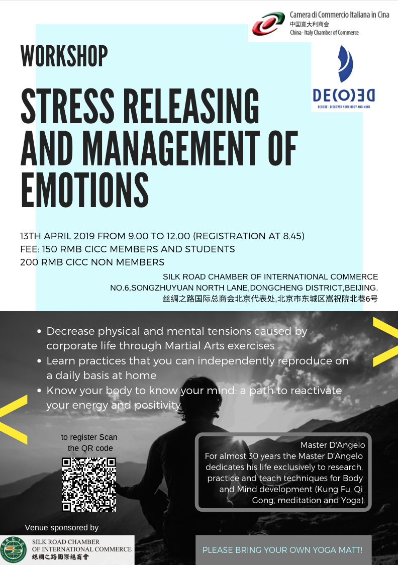 中国意大利商会非常高兴邀请您参加“压力释放与情绪管理”活动,该活动将于4月1日在丝绸之路国际总商会北京代表处北京市东城区嵩祝院北巷6号举行。