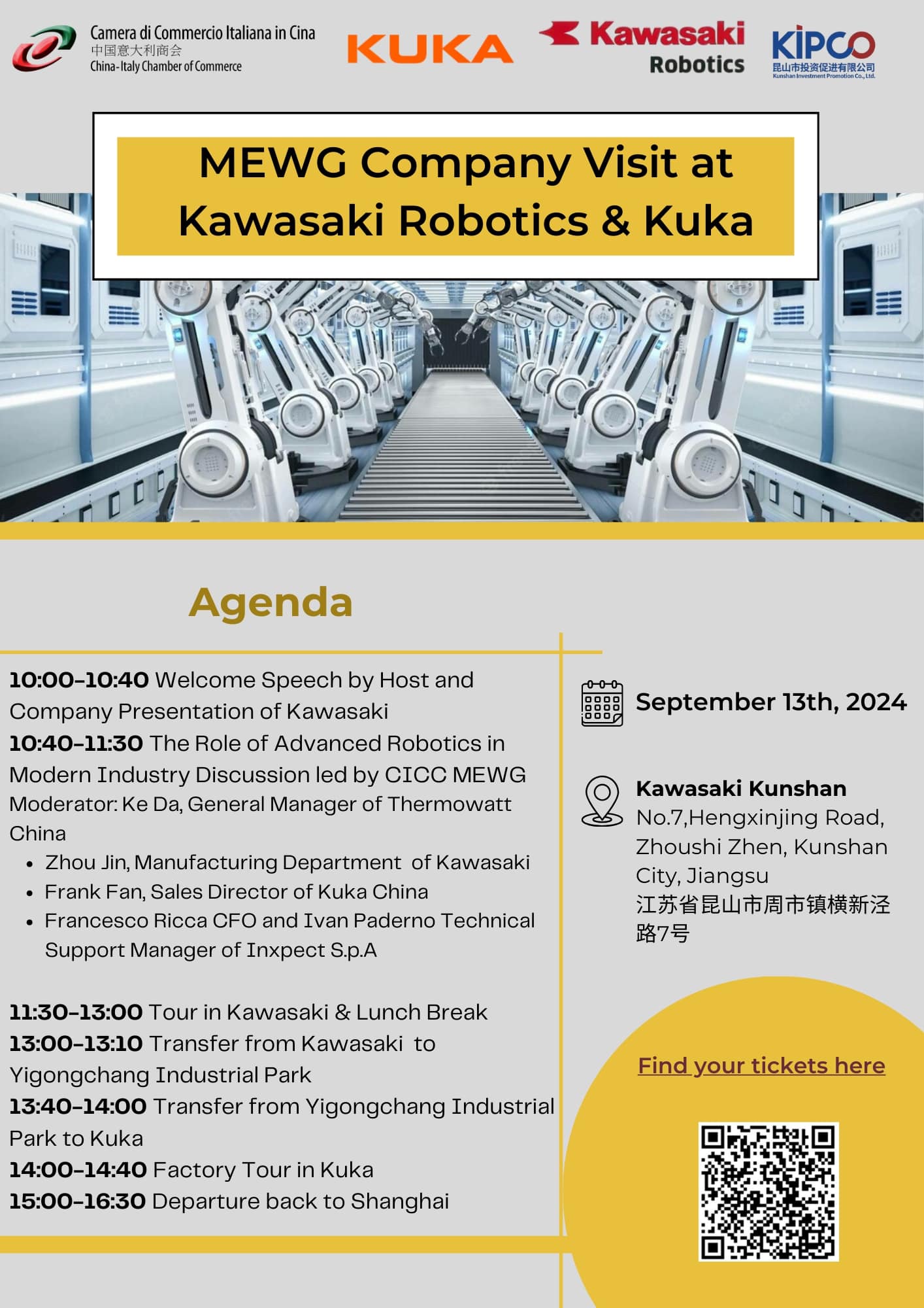 The new event from the Mechanical Engineering Working Group (MEWG) Company Visit series. The event, organized by the China-Italy Chamber of Commerce in collaboration with the MEWG and the Kunshan Invest Promotion, will take place on September 13th, 2024, in Kunshan Suzhou.