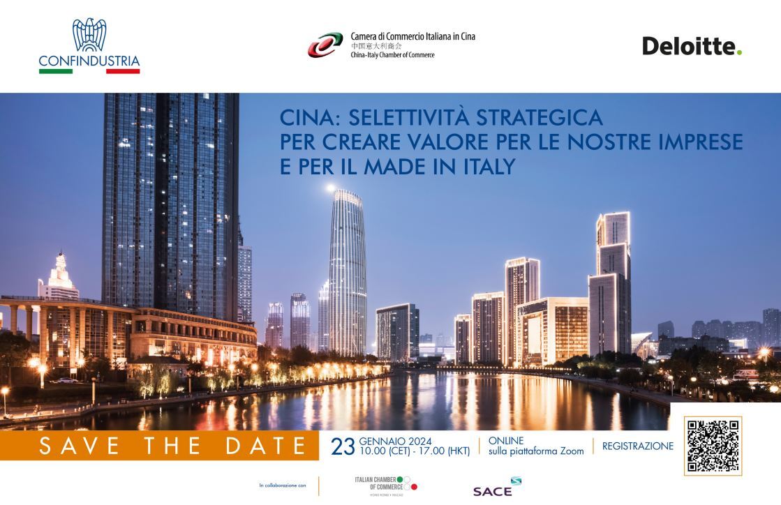 La Camera di Commercio Italiana in Cina, Confindustria e Deloitte organizzano il seminario online “Cina: selettività strategica per creare valore per le nostre imprese e per il Made in Italy”. Il webinar si terrà martedì 23 gennaio 2024 alle 10:00 orario italiano (17:00 orario cinese) sulla piattaforma Zoom.