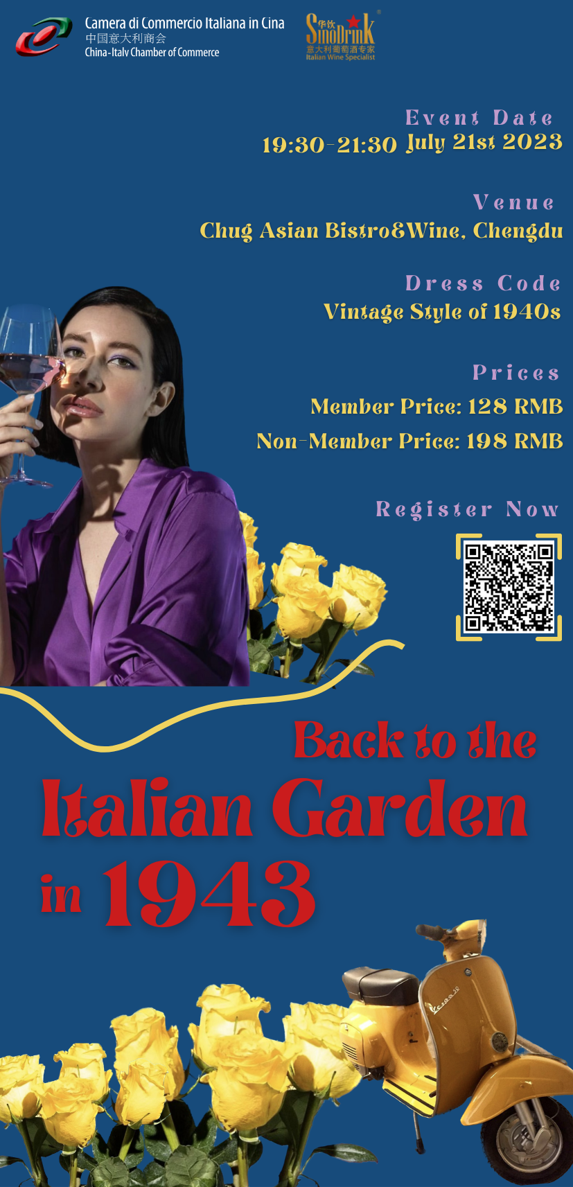 China-Italy Chamber of Commerce is pleased to invite you to join us in the “Back to the Italian Garden in 1943 with Five Roses", a vintage wine party in cooperation with SinoDrink to be held on July 21st 2023 at 19:30- 21:30 at Chug Asian Bistro&Wine, Chengdu.