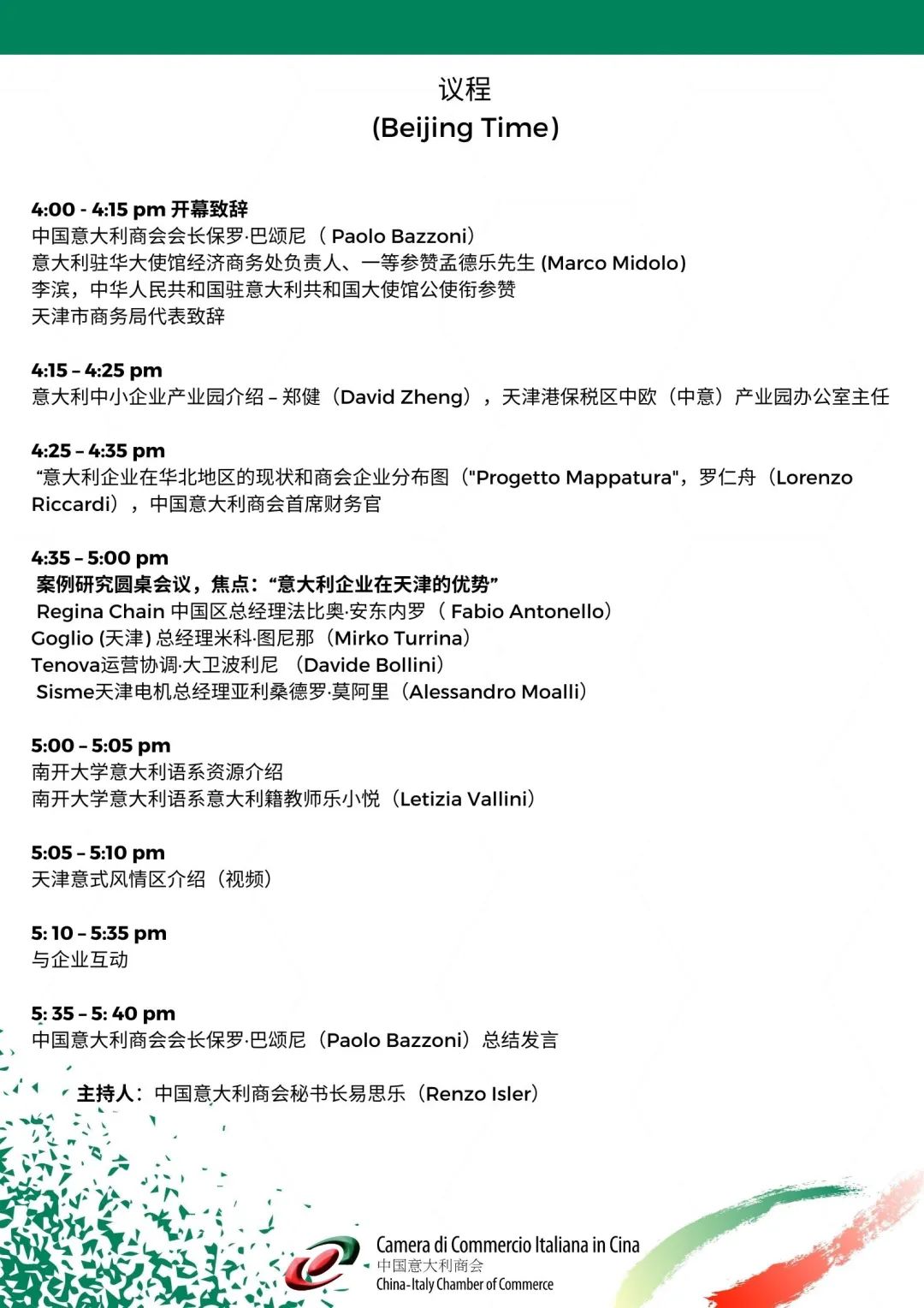 本次对话为计划以天津地区为切入点进入中国市场的意大利企业提供机会,加强与已入驻天津地区意大利企业的互动,总结和分享在当地成功运营的经验。