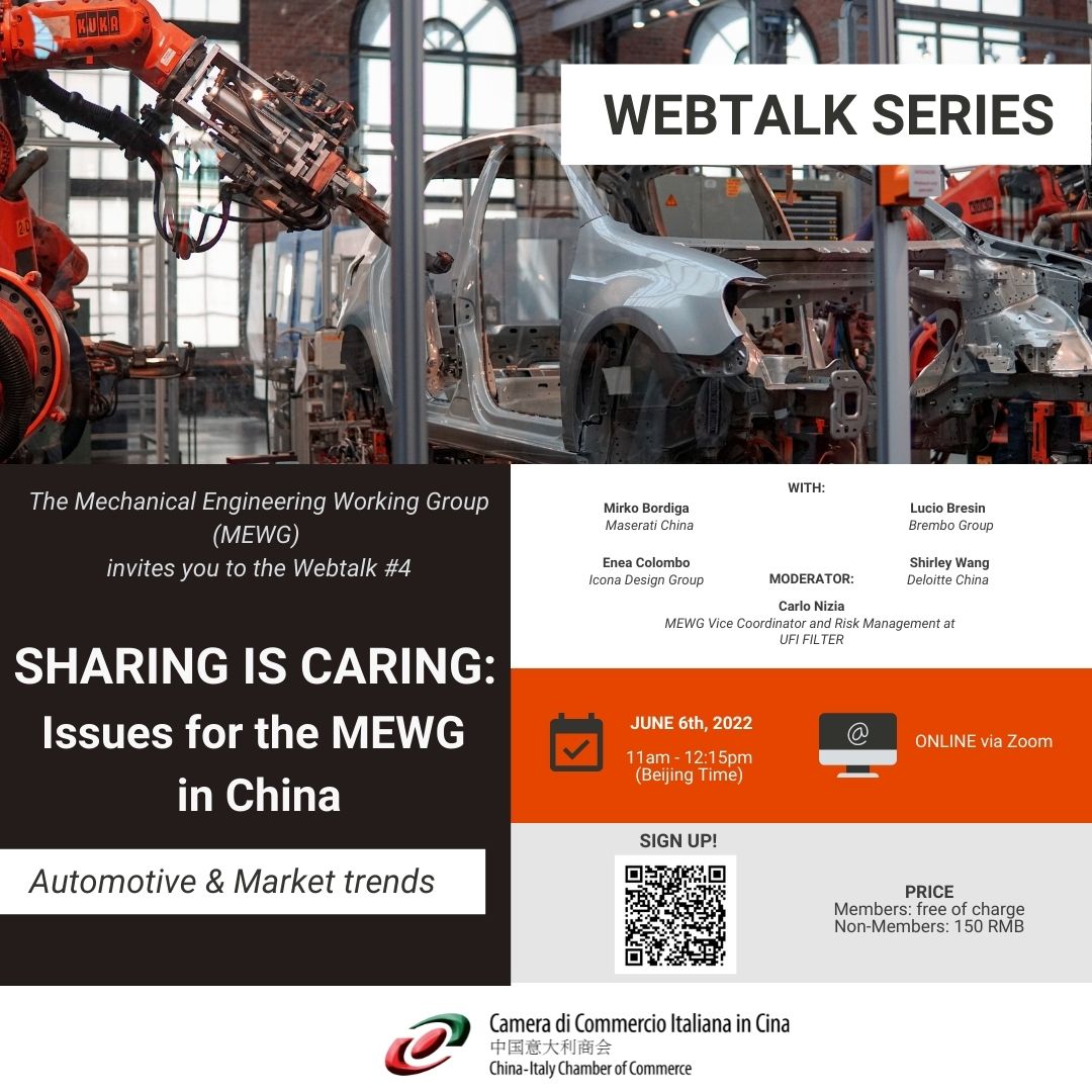 The 4th webtalk of "Sharing Is Caring: Issues for the MEWG in China" will take place on June 6th, 2022 at 11:00 am (Beijing time). "Sharing Is Caring" is the new webinar series launched by the China-Italy Chamber of Commerce (CICC) together with our Mechanical Engineering Working Group (MEWG).