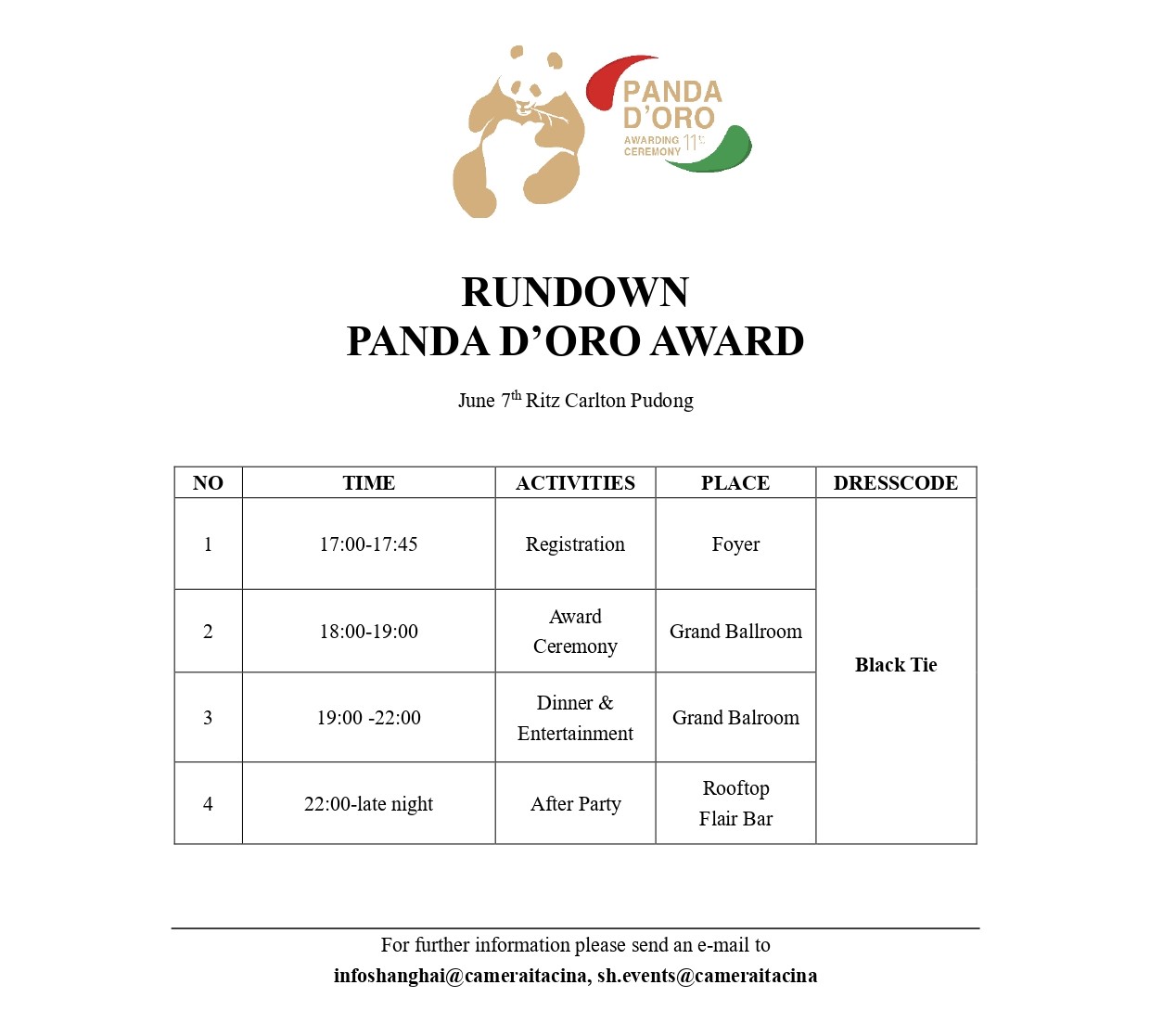 两年的漫长等候,我们终于迎来了由中国意大利商会主办的第十一届金熊猫颁奖典礼。本次盛宴将于周一6月7日,在浦东利兹卡尔顿隆重举办。