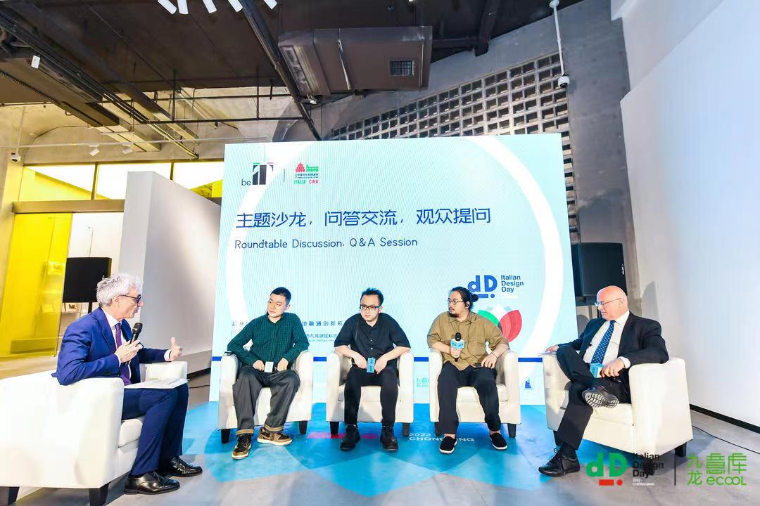 在稍后的主题沙龙中,参加活动的嘉宾与观众进行了问答与交流。浙江大学建筑工程学院特聘教授罗杰威先生、“2022年意大利设计大使”马晓利先生、重庆交通大学艺术设计学院副教授刘第秋先生、招商蛇口产业园区事业部重庆九龙意库项目总监田锦励先生与鲸落创意创始人甘纯先生围绕城市更新、数字媒体艺术、可持续发展、科技创新等领域展开探讨,向中意两国企业展示了前沿城市规划的新模式和新机遇。