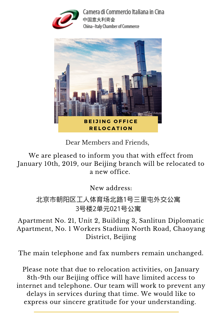 我们很高兴通知您,自2019年1月10日起,我们在北京的办事处将迁至新地址。