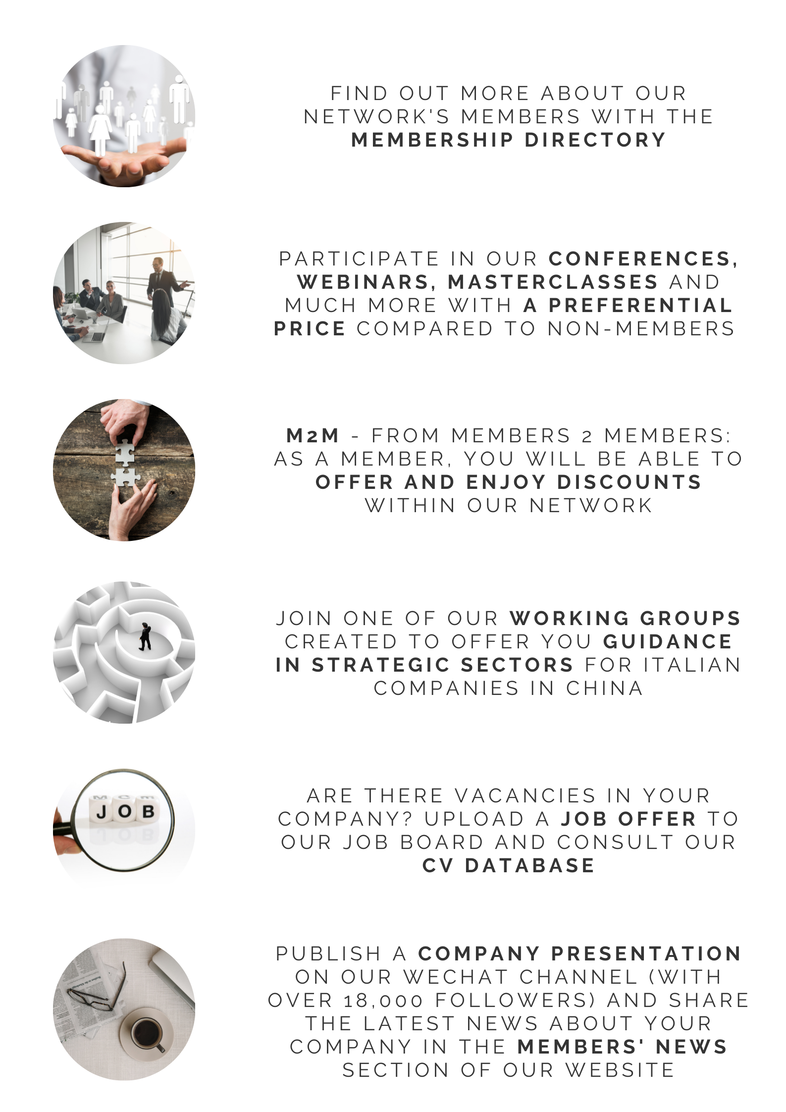 ▪ You will have the opportunity to participate in events organized exclusively for our members and take part in meetings with high-level local officials and Chinese and Italian experts