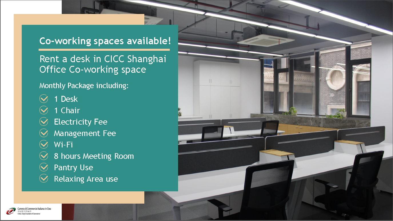 The China-Italy Chamber of Commerce Shanghai Office has recently moved to a new building, in the center of Shanghai. The new spacious CICC office has the possibility to offer desks to companies, Members and Non-Members for working with own workstation in a dynamic and Italian atmosphere.