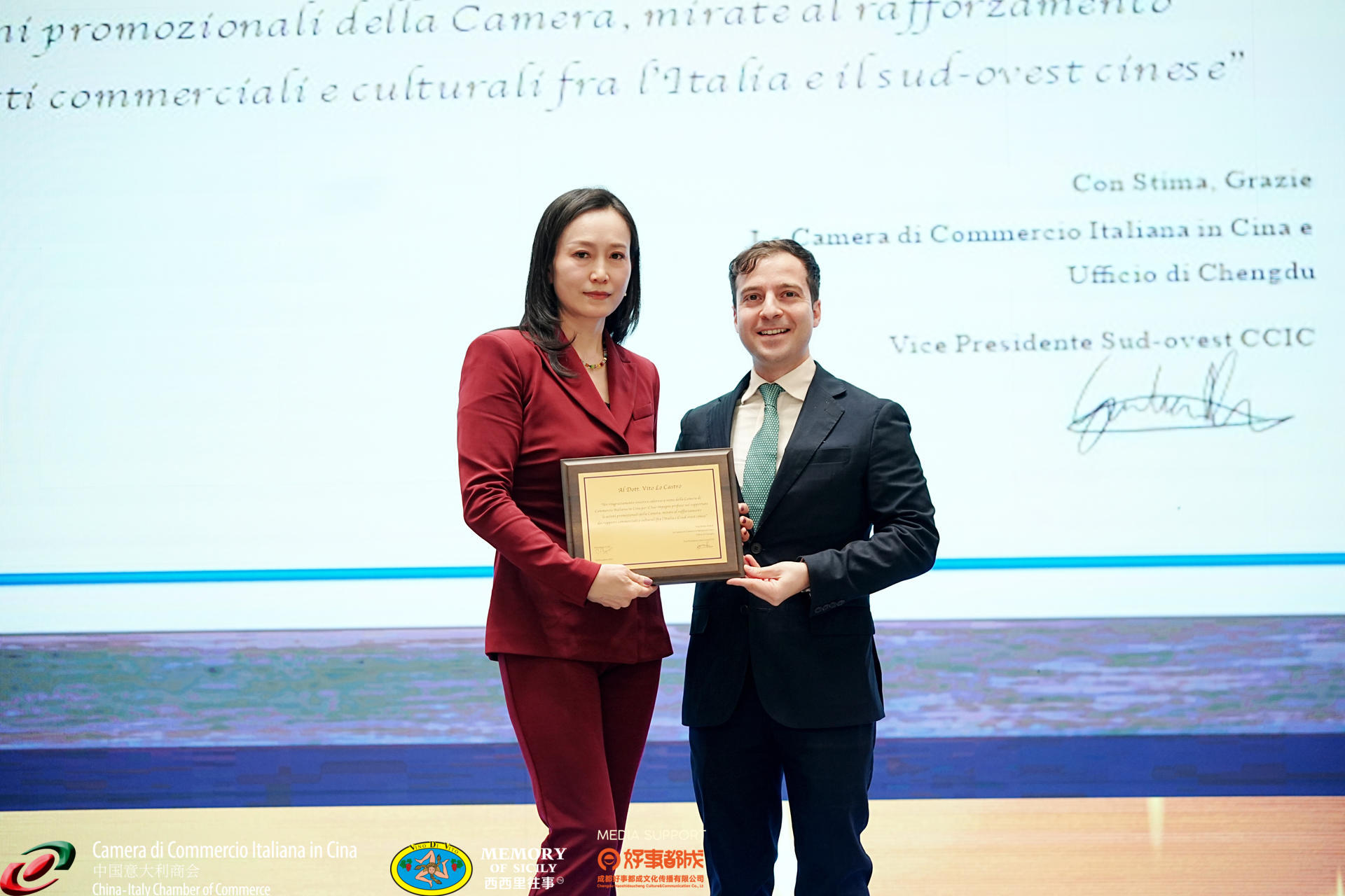 Mr. Gianluca Luisi, on behalf of the Board of Directors and Paolo Basconi, President of CICC, presented a plaque to Memoria della Sicilia, expressing gratitude for outstanding contributions to cultural exchanges between two great nations in South-West of China.