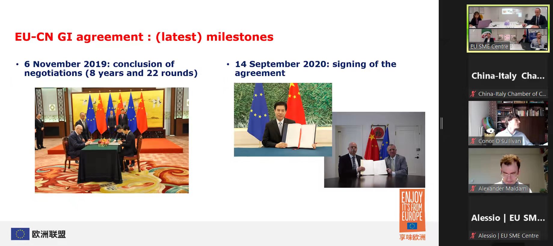 The webinar was opened by Mr Damien Plan, Counselor for Agriculture for EU Delegation to China, presenting in detail the EU-China agreement protecting geographical indications.