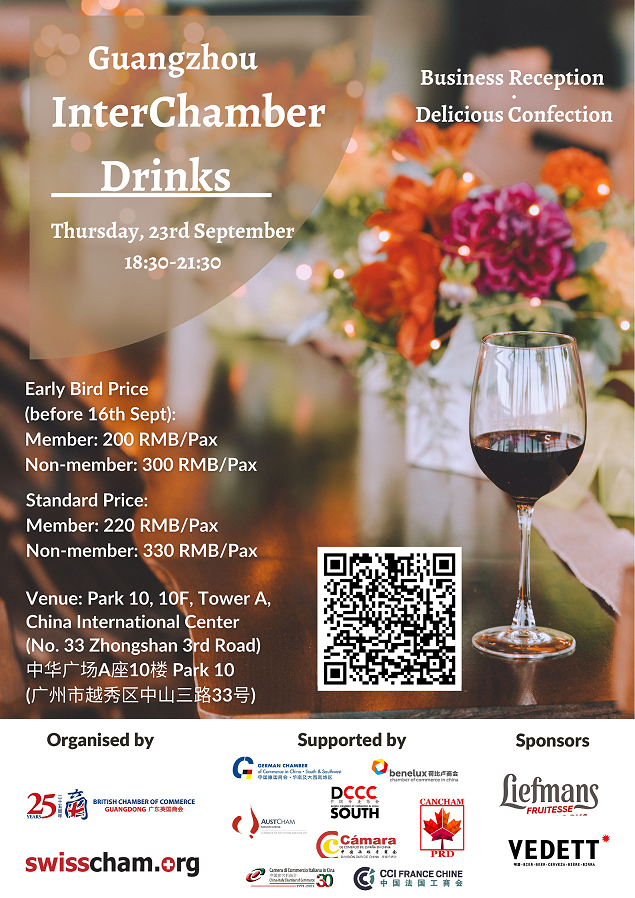 The China-Italy Chamber of Commerce (CICC), in cooperation with the British Chamber of Commerce Guangdong, the Australian Chamber of Commerce - South China, the Benelux Chamber of Commerce in China, the French Chamber of Commerce and Industry in China, the German Chamber of Commerce - South and Southwest China, the Swiss Chinese Chamber of Commerce in China, the Danish Chamber of Commerce in South China, the Spanish Chamber of Commerce in China and the CanCham PRD, is glad to invite you to the Interchamber Business Networking which will be held in Guangzhou on September 23rd, 2021.