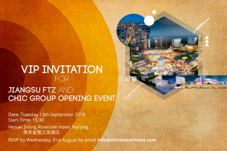 The Jiangsu Free Trade Zone (Test Zone) and Chic Group opening event will take place at 15:30 on Tuesday 13th September at the Jinling Riverside Hotel, Nanjing.