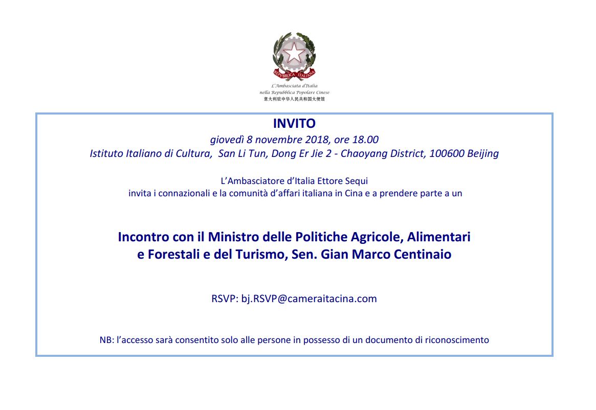 Invito: Incontro con il Ministro delle Politiche Agricole, Alimentari e Forestali e del Turismo, Sen. Gian Marco Centinaio - 8 Novembre 2018, Pechino