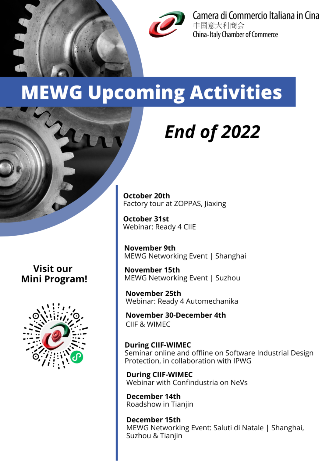 The event was joined by almost 30 participants, who engaged in an interesting discussion concerning several topics and issues involving the Mechanical Engineering Working Group. Carlo Nizia, MEWG Coordinator and Risk Management at Sofima Automotive Filter (Shanghai) Co., Ltd., started the meeting with a presentation of the activity plan for the second half of the year 2022, including webinars, networking events, and factory tours. The most important projects consist of B2B Matchmaking with many Chinese counterparts, cooperation with Tongji University, and the constant opinions sharing activities on important topics and issues through a detailed schedule of webinars and debates. Among the other events, the China International Industry Fair (CIIF) and the Week of Italian Mechanical Engineering in China (WIMEC), scheduled from November 30th to December 4th, were given special mention due to their importance.