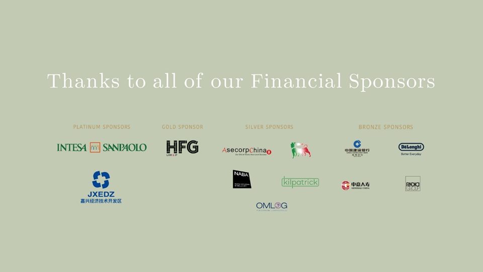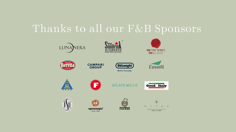 Thank you AAC Wine, Bella Vita, Bund One Art Museum, De'Longhi, Calzedonia, City News Service, Gelato Bello, HFG, Itema, Moleskine, NABA, Easail.