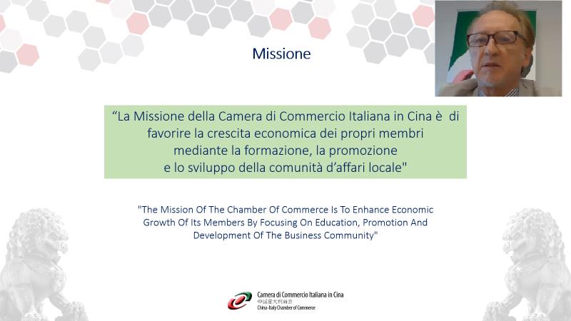最后,中国意大利商会会长保罗·巴颂尼提出了“使命,管理和战略重点”,强调了中国意大利商会致力于通过培训,促进和发展本地商业社区,来推动会员的经济增长。中国意大利商会将于2020年9月15日至19日参加在上海举行中国国际工业博览会,并联合举办“中国国际工业博览会和机械周”