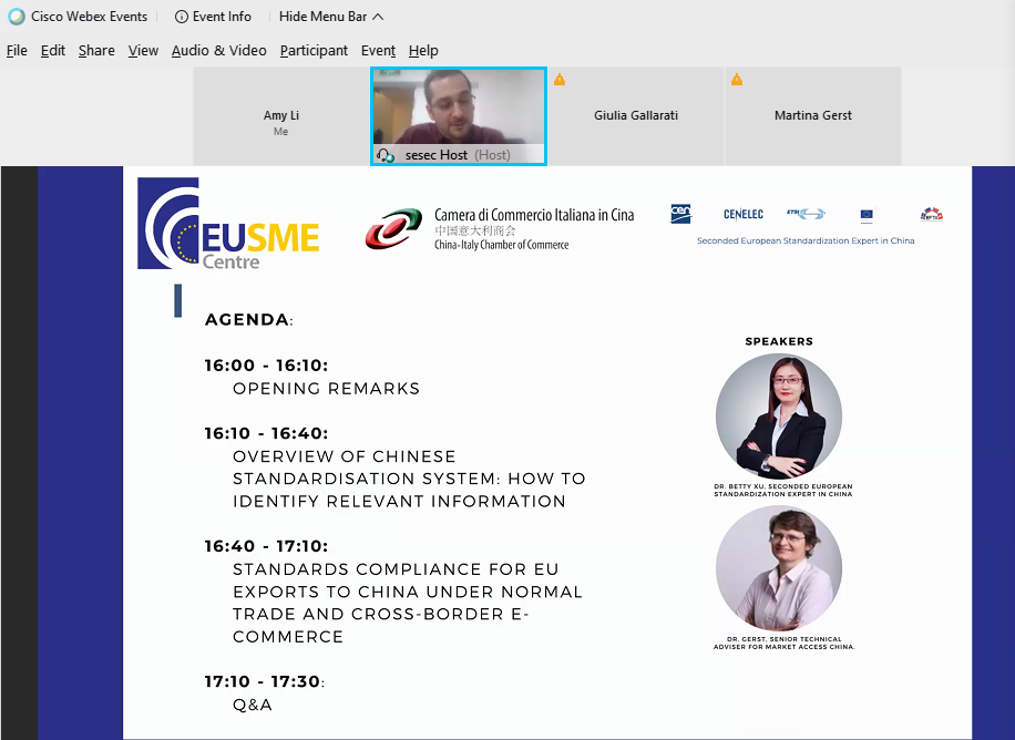 the webinar “Chinese Standards & Compliance for European Exporters”, organized in collaboration with the EU SME Centre and the Seconded European Standardisation Expert in China (SESEC) Project, has been held on January 28th, 2021.
