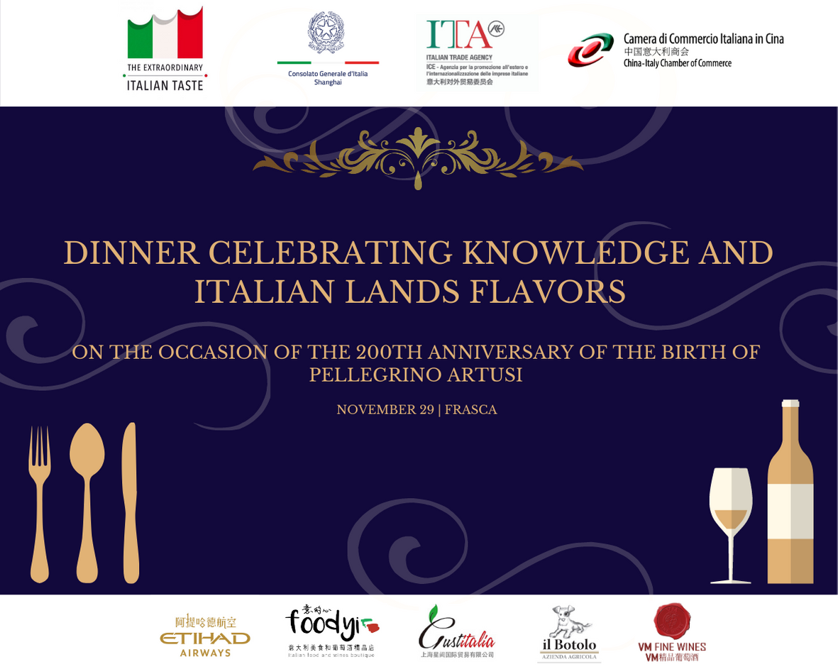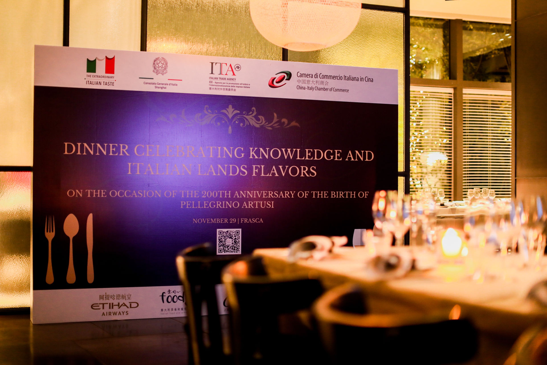 At the end of the “ 5th Week of the Italian Cuisine in the World” and in honor of the 200th anniversary of the birth of Pellegrino Artusi, the China-Italy Chamber of Commerce (CICC) and The Italian Trade Commission (ITA-ICE), with the support of the Consulate General of Italy in Shanghai, held a dinner to celebrate the knowledge and Italian Lands Flavors at the restaurant Frasca.