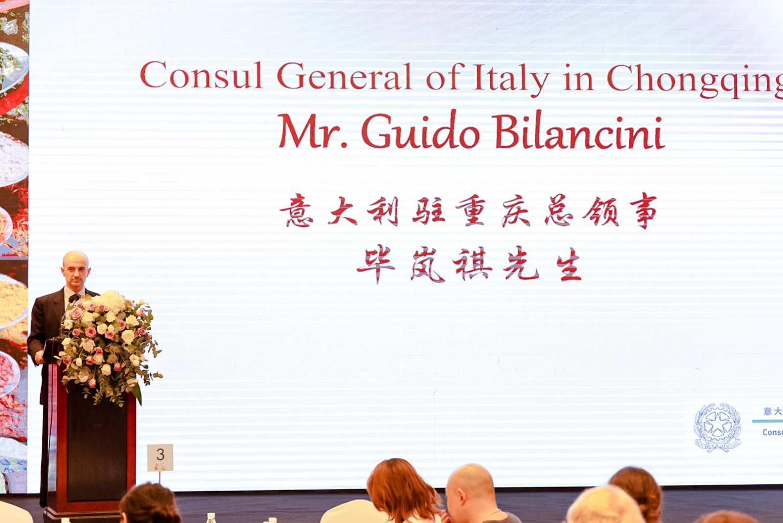 Successivamente, Guido Bilancini, Console Generale d'Italia a ChongqingPaolo Bazzoni, Presidente della CCIC, hanno tenuto rispettivamente i discorsi di benvenuto. Il Console ha fatto riferimento al fenomeno dei prodotti "Italian sounding" nel mercato cinese e ha sottolineato l'importanza di identificare l'autenticità dell'origine dei prodotti. Il Presidente della CCIC, invece, ha affermato che l'Italia è al primo posto in Europa per i prodotti agroalimentari di qualità, e ha auspicato che tra la Cina e l'Italia possano avere luogo sempre più scambi costruttivi nel settore F&B.