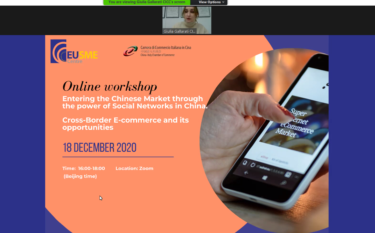The China-Italy Chamber of Commerce (CICC), as a leading partner of the EU SME Centre, is glad to inform you that the online workshop "Entering the Chinese Market through the power of Social Networks in China. Cross-Border E-commerce and its opportunities" took place successfully via Zoom on December 18th, 2020. The Workshop focused on the digital world in China, on the trends of Chinese consumers and the most popular digital platforms. It was aimed at small and medium-sized enterprises located in Europe, interested in approaching the Chinese market. The event was attended by many experts of the sector, for a total of more than 70 people connected.