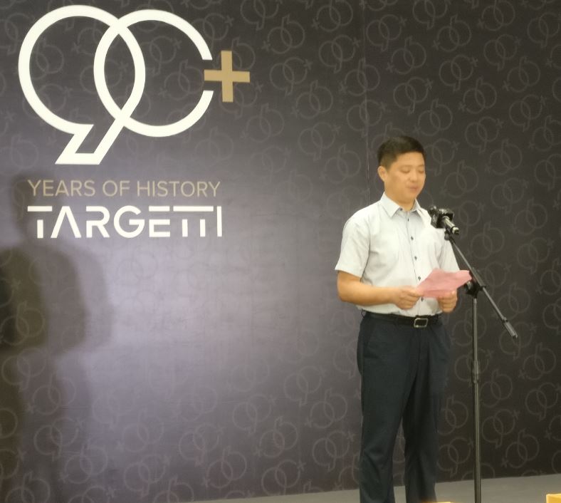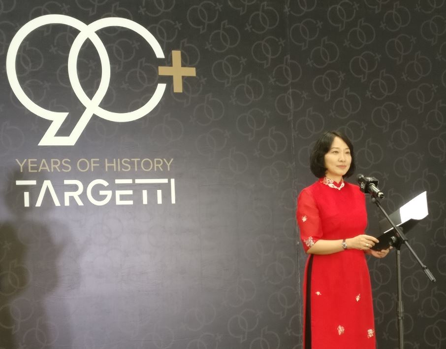 The following speaker, Mr. Xu Yawei, Vice Director of People's Government of Xinbei District transmitted the greetings of Government. Mrs. Emanuela Vizzarro, Shanghai and Suzhou Office Manager, transmitted the greetings of the China-Italy Chamber of Commerce and congratulated Targetti Group for the achievements.