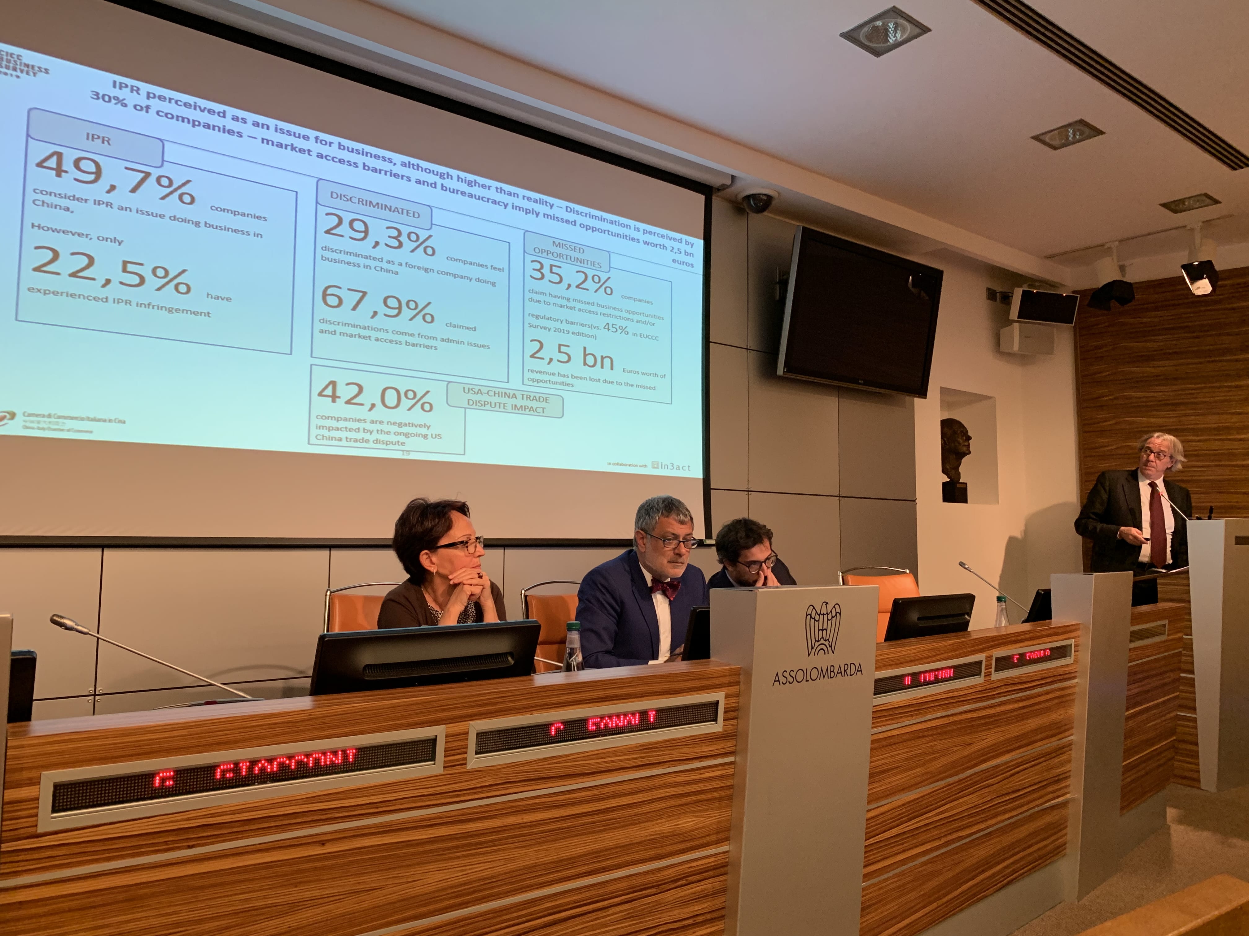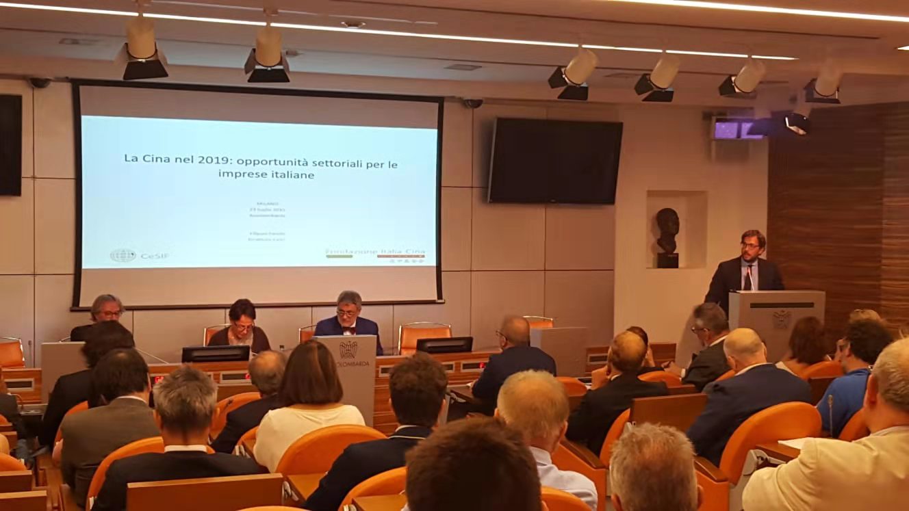 在陈述完之后,CeSIF总监(Centro Studi per l’Impresa della Fondazione Italia Cina) Filippo Fasulo先生,向公众展示了对中国市场感兴趣的意大利公司可能抓住的新机遇。事实上,由于分析了中国目前必须面对的国内和外部挑战,如经济增长放缓和前面提到的与美国的经济紧张关系,Filippo Fasulo概述说,例如,中国中产阶级生活条件的改善和人口老龄化,为奢侈品和制药关键行业的内需增长前景以及为提高工业生产质量而进行的巨额研发投资打开了一扇窗。