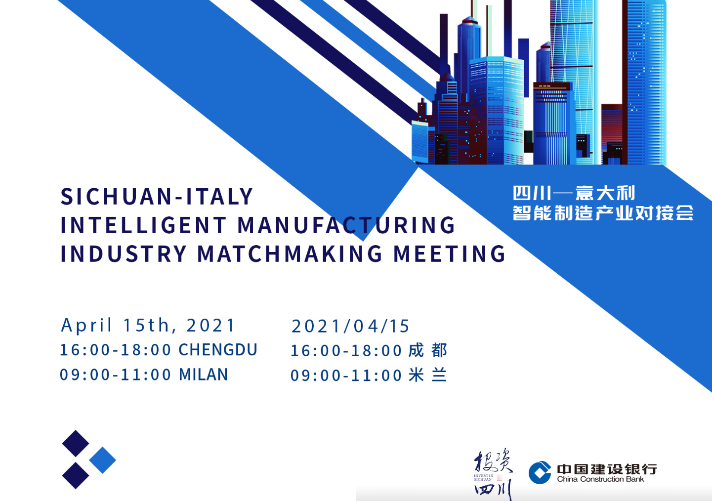 中国意大利商会很高兴地通知您,由四川省经济合作局和中国建设银行共同举办的四川-意大利智能制造产业对接会在意大利驻重庆总领事馆、中国和意大利商会和意大利对外贸易委员会的支持下于2021年4月15日在成都成功举行,意大利驻重庆总领事毕岚祺先生(Guido Bilancini),中国意大利商会会长保罗·巴颂尼先生(Paolo Bazzoni)和意大利对外贸易委员会北京办事处首席代表暨中国区以及蒙古国总协调官Gianpaolo Bruno先生以线上的方式出席了对接会并发表了讲话。