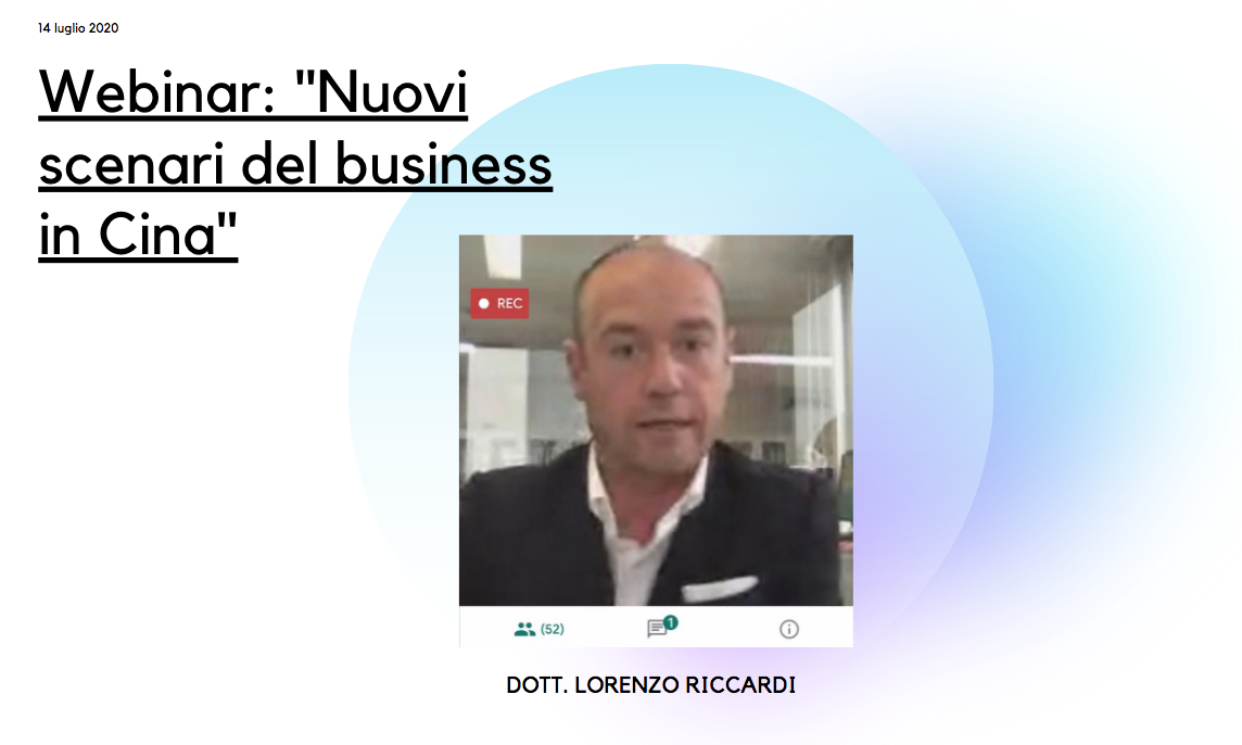 Il webinar "Nuovi scenari del business in Cina" organizzato dal Nuovo Centro Estero Veneto in collaborazione con la Camera di Commercio Italiana in Cina, si è svolto online il giorno 14 luglio 2020 su piattaforma Google Meet.