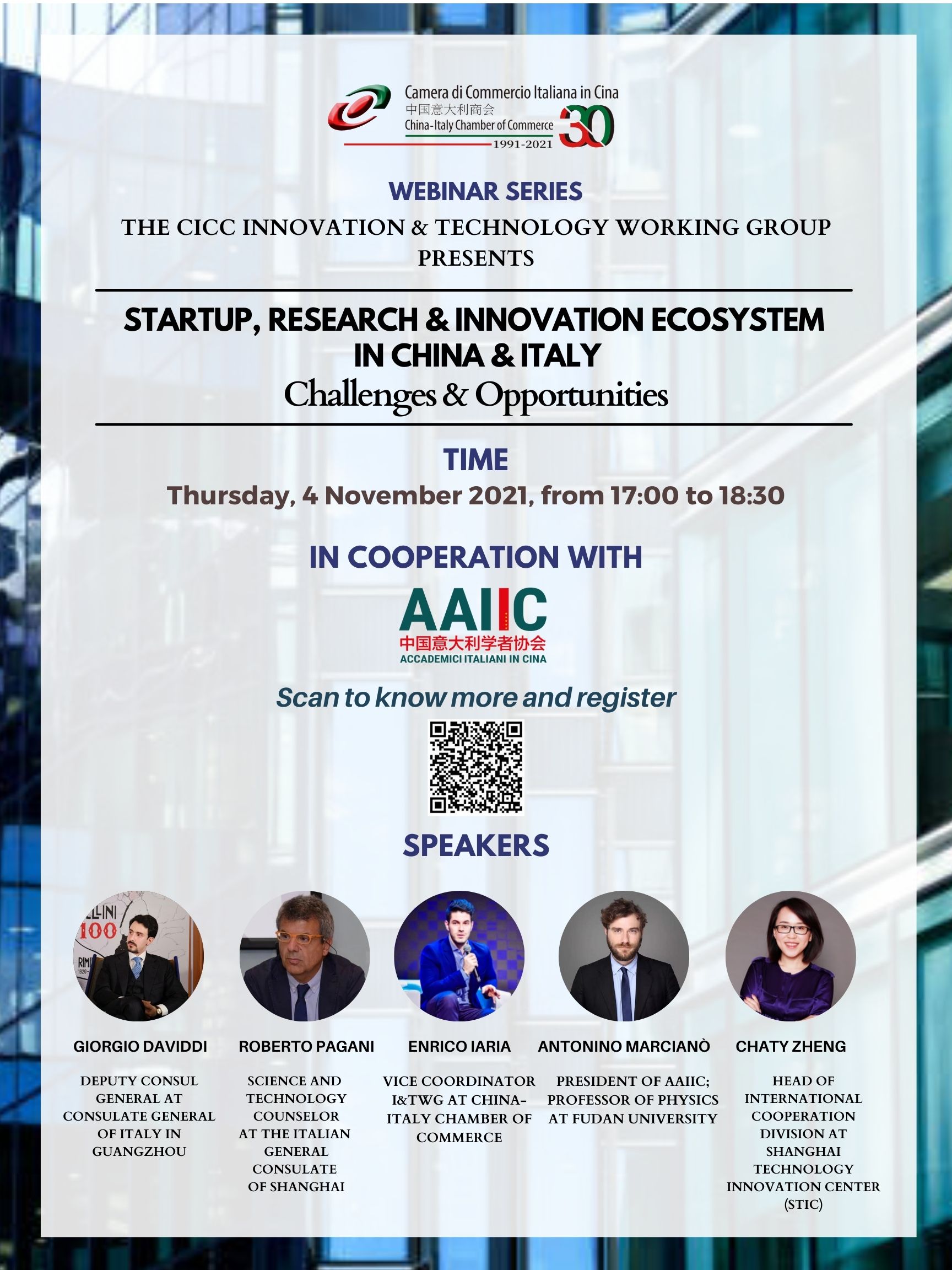 The China-Italy Chamber of Commerce is glad to inform you that the Webinar "Startup, Research and Innovation Ecosystem in China and Italy“ was held on Nov 4, 2021.