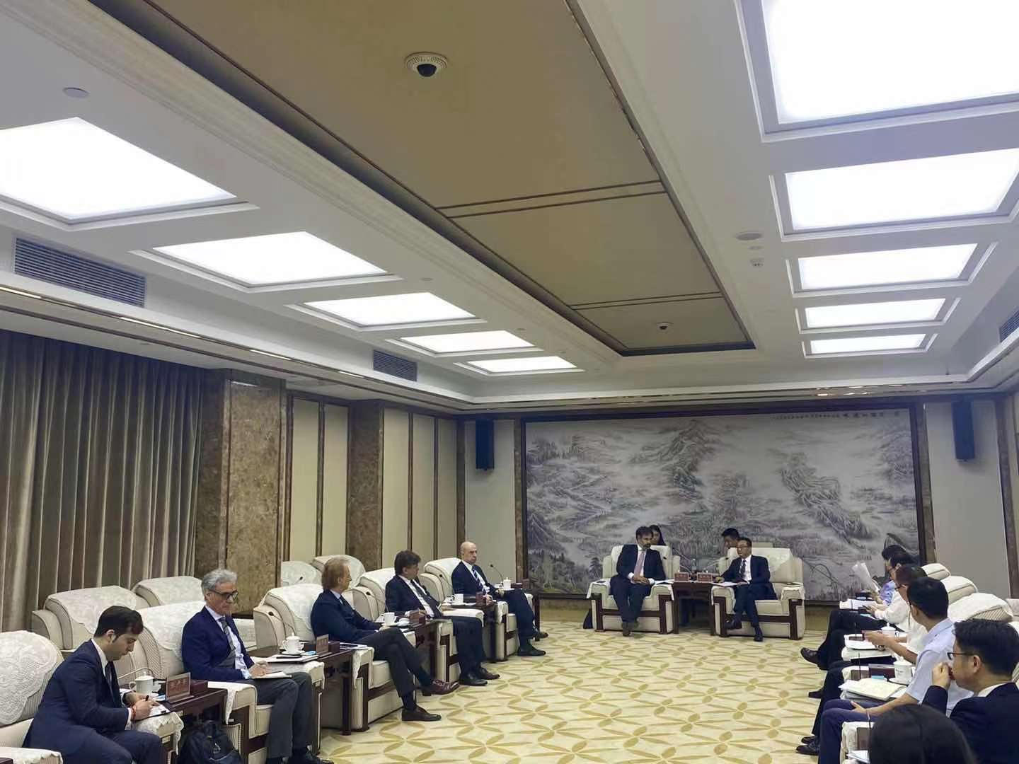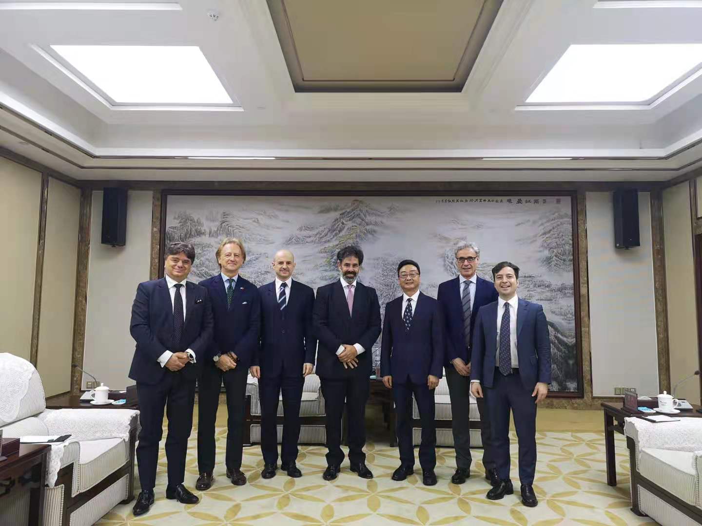 上午,由意大利驻华大使馆公使衔参赞兼经济商务处负责人德玛睿(Emanuele de Maigret),意大利对外贸易委员会北京办事处首席代表暨中国区和蒙古国总协调官张保龙·布鲁诺(Gianpaolo Bruno),意大利驻重庆总领事毕岚祺(Guido Bilancini),科技参赞兼商务处负责人龚卓龙(Lorenzo Gonzo),中国意大利商会会长保罗·巴颂尼(Paolo Bazzoni),中国意大利商会董事张卢卡(Gianluca Luisi)组成的代表团一行前往重庆两江新区,与两江新区管理委员会领导进行会面,讨论了意大利企业在重庆两江新区开展的多领域、多层次的国际交流与合作,并参观了数据经济产业园展示中心。