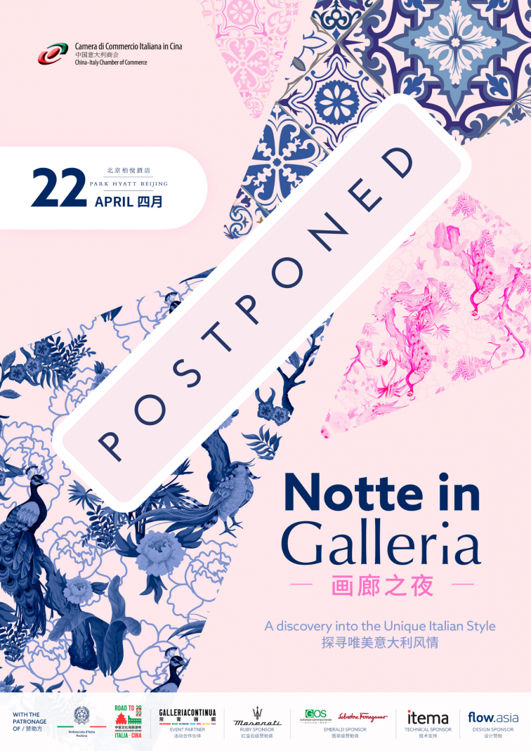 In response to the current Covid-19 situation, the China-Italy Chamber of Commerce regrets to inform you that our signature Italian Night "Notte in Galleria", originally scheduled for April 22nd, has been postponed to a later date before summer. We will inform you of the new date in the following weeks as soon as it is confirmed.