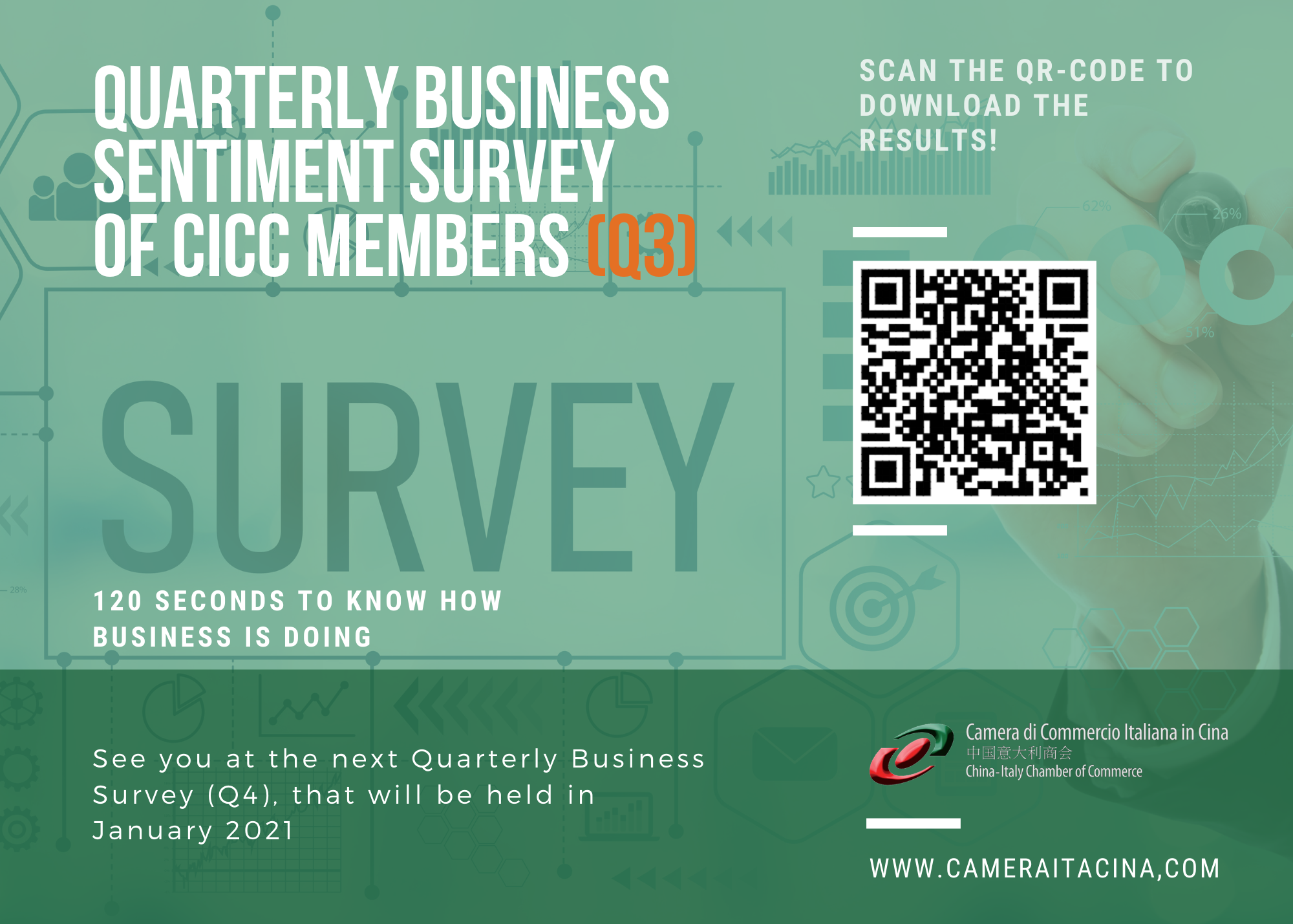 The CICC thanks all 199 companies for taking part in the Survey, helping to create added value and providing the tools to improve concrete support for the Italian business community in China. The next quarterly business sentiment survey will be held on January 2021.
