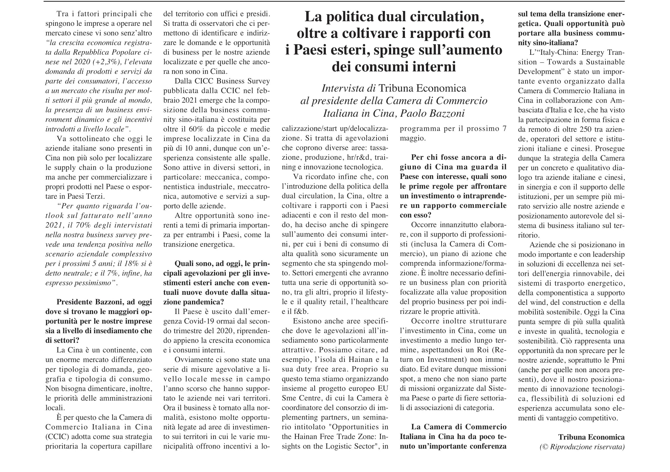 La Camera di Commercio Italiana in Cina è lieta di condividere con voi l'intervista rilasciata dal nostro Presidente Paolo Bazzoni al giornale "Tribuna Economica".