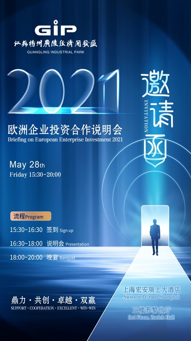 The China-Italy Chamber of Commerce is pleased to inform you that the Guangling Industrial Park will organize the event “Briefing on European Enterprise Investment 2021”, on Friday, May 28th, 2021, at Swissotel Grand Shanghai (上海宏安瑞士大酒店静安区愚园路1号 / 详细活动地点: 三楼,苏黎世厅).