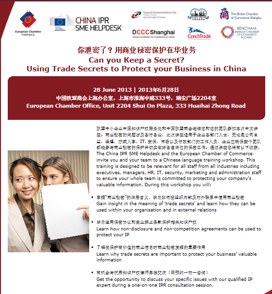 China IPR SME Helpdesk events are available to European Small and Medium Enterprises (SMEs) and SME intermediary organisations such as embassies or consulates, chambers of commerce and trade associations only. China IPR SME Helpdesk events are closed to law firms and consultants who offer IPR services. If you meet the criteria and would like to attend please register by emailing rsvp-china@china-iprhelpdesk.eu with the name and date of the event in the subject line and your company information. You will receive a confirmation email. Because places are limited, in the case of unexpected cancellations please inform the Helpdesk as soon as possible.