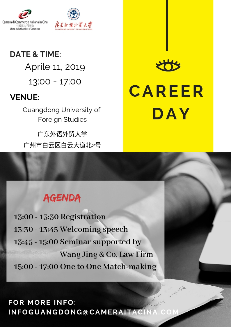 The China Italy Chamber of Commerce is glad to invite you to the second edition of the Guangzhou Career Day which will take place on April 11th at the Guangdong University of Foreign Studies (广州市白云区白云大道北2号广东外语外贸大学).