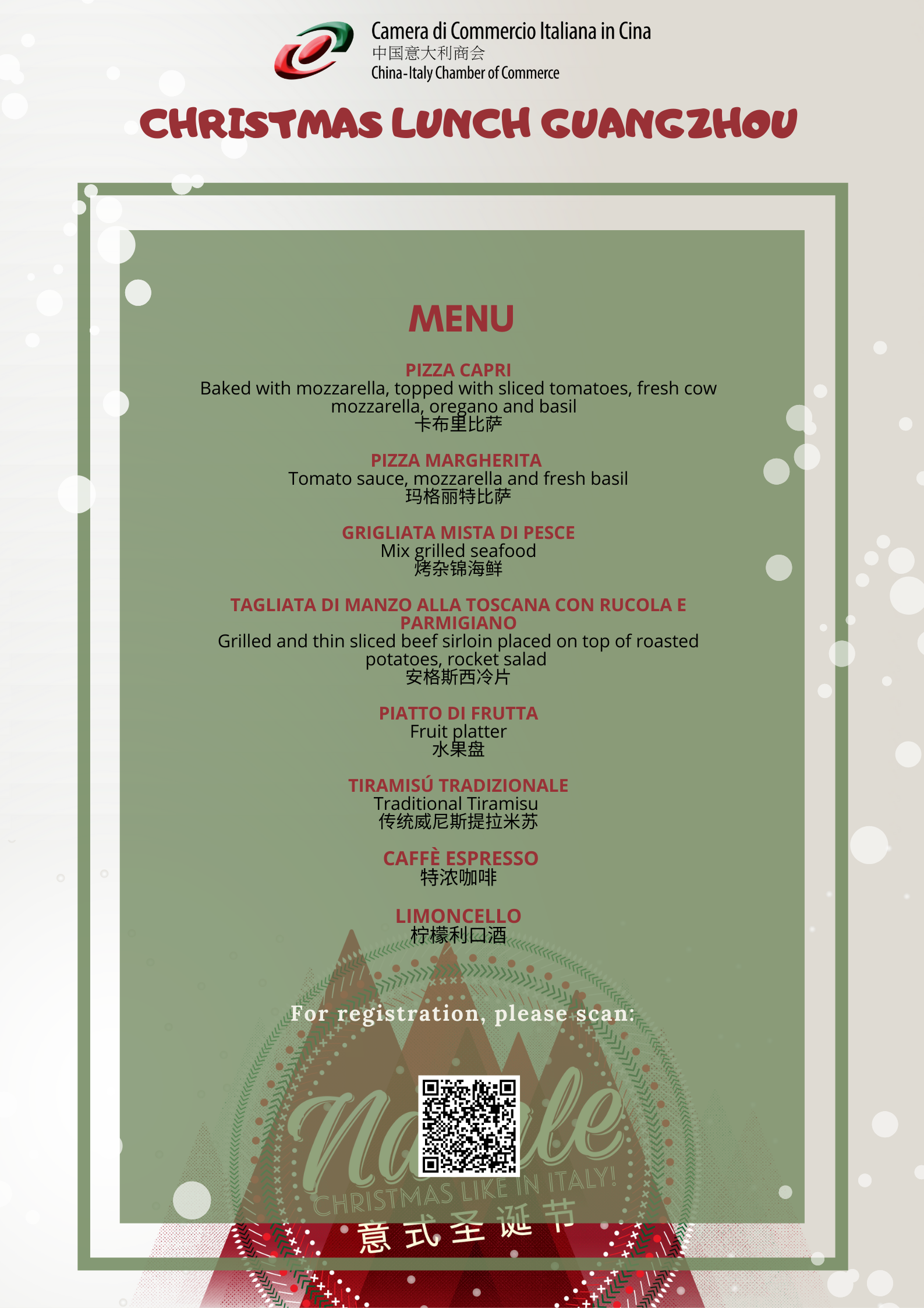 The China-Italy Chamber of Commerce (CICC) is glad to invite you to the Christmas Lunch which will be held on 20th December in Guangzhou at OGGI Restaurant.