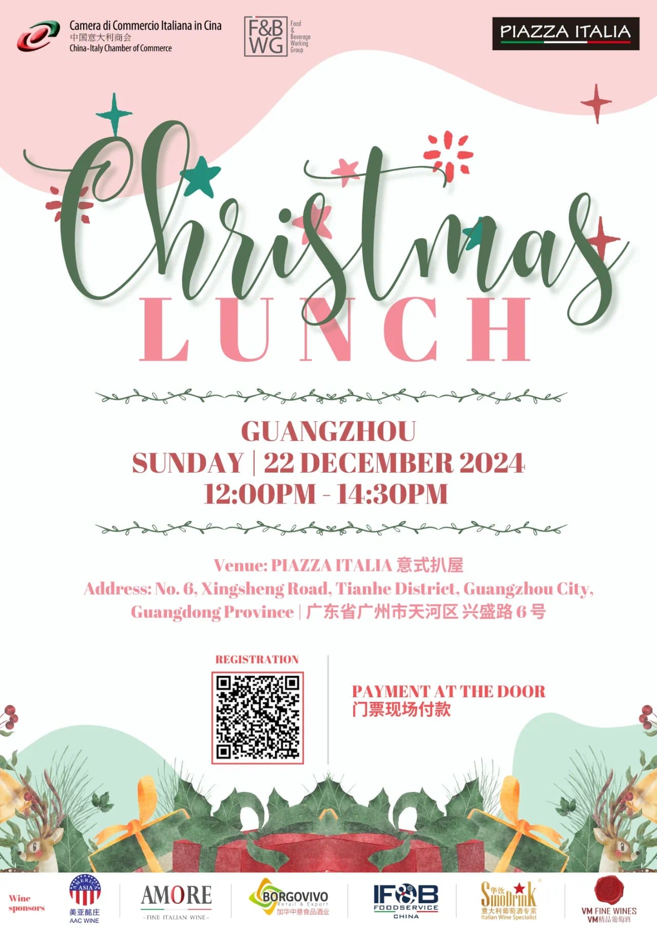 The Food & Beverage Working Group of China-Italy Chamber of Commerce (CICC F&BWG) is delighted to invite you to join the upcoming Christmas Lunch, scheduled on Sunday December 22nd, 2024, at Piazza Italia restaurant in Guangzhou.